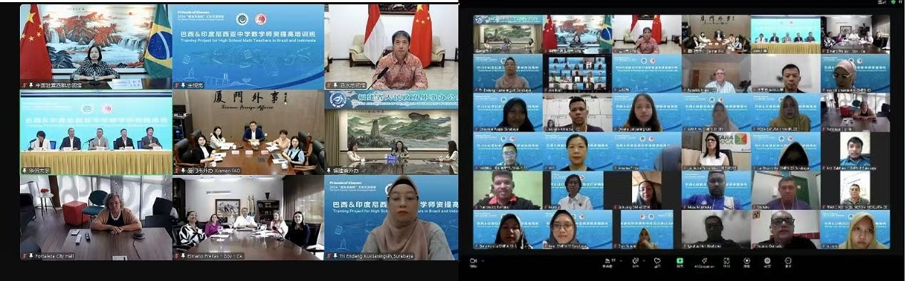 10月16日,由福建省人民政府外事办公室、驻累西腓总领馆、驻泗水总领馆指导,厦门市人民对外友好协会和华侨大学共同主办的2024“睦友乐相知”文化交流项目——巴西和印度尼西亚中学数学师资培训班线上开班仪式成功举办。省外办副主任黄劭蓉、驻累西腓总领事兰和平、驻泗水总领事徐永、厦门市外办主任张权、华侨大学副校长林宏宇和巴西塞阿腊州州长埃尔诺·德·弗雷塔斯、印尼泗水市教育局代表古斯媞安宁西,以及来自巴西八个州和印尼泗水市的3000多名参训教师代表出席开班仪式。