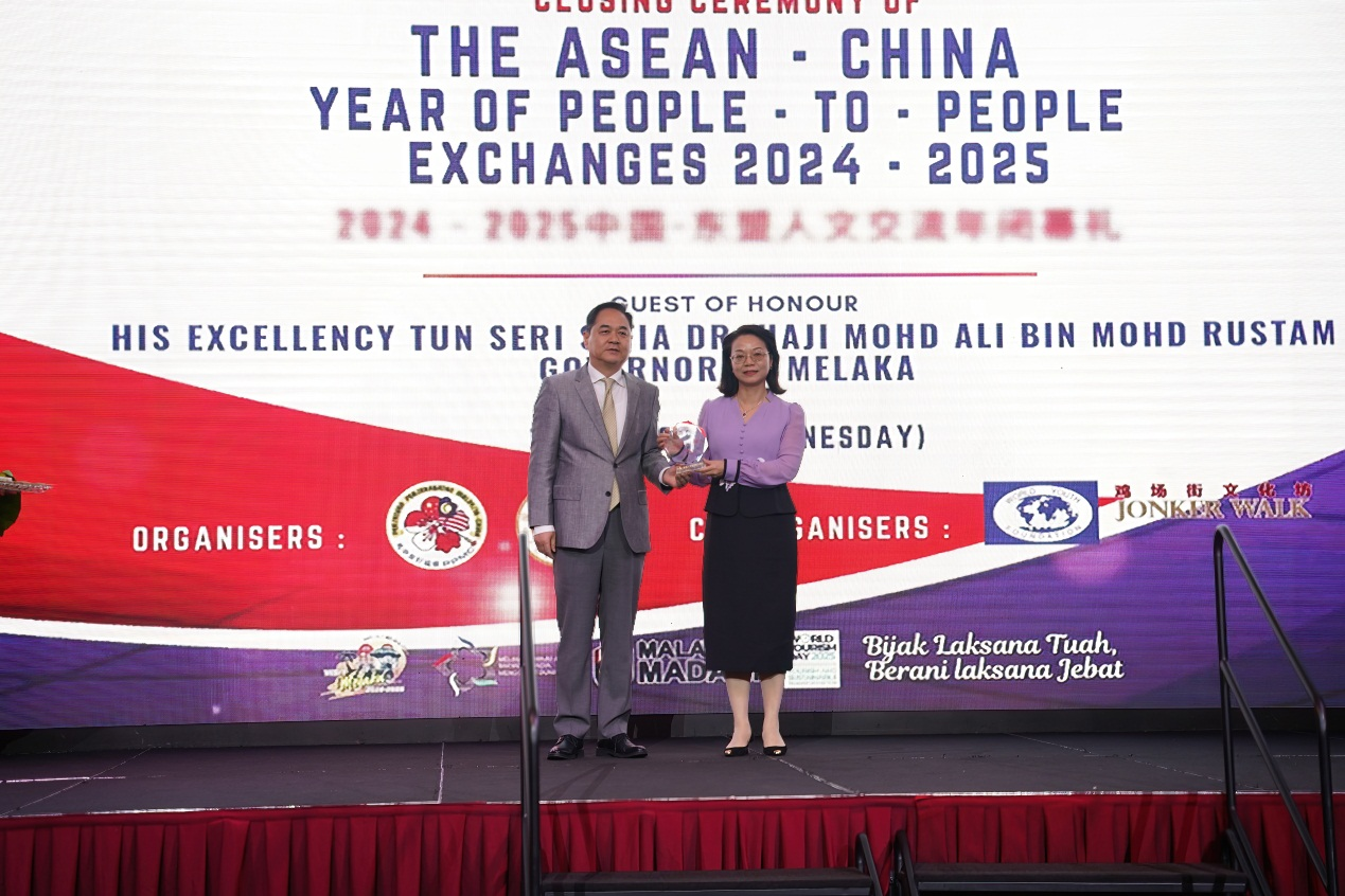 12月10日上午,2024-2025中国—东盟人文交流年闭幕式在马来西亚马六甲州举行,其间,颁发了“中国—东盟人文交流年十大项目”奖项,由福建省人民政府和中国人民对外友好协会共同主办的“2024中国—东盟人文交流年开幕式”获此殊荣,省外办党组成员、副主任黄劭蓉应邀出席闭幕式并领奖。