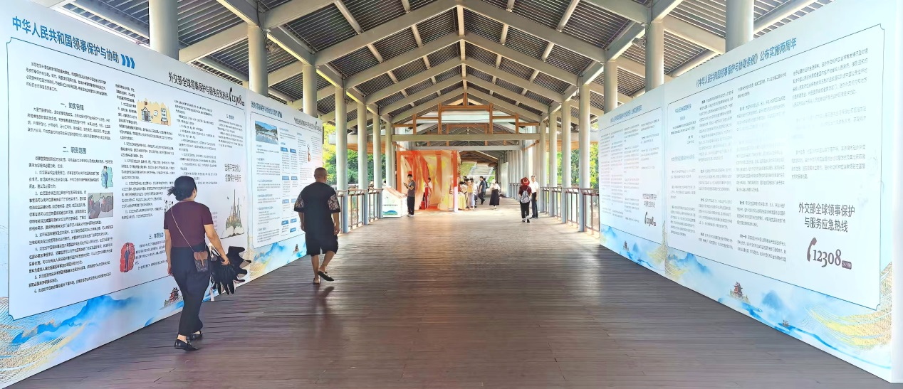 “水陆联动” 的宣传模式成为此次活动现场另一大亮点。广场上,印有活动主题及 “海上和平女神” 妈祖像的宣传旗帜与打卡展板醒目矗立,工作人员现场指导群众下载 “中国领事” APP,发放领事保护宣传资料。公园里,园区观光车化身移动宣传站,随车配备领保知识手册供群众随手取阅。绶溪上,两艘张贴 “12308 领事保护热线” 字样的主题游船穿梭于荔林水乡,船内显示屏滚动播放宣传视频,涵盖出境出行建议、跨境诈骗防范等内容,于诗意山水间让领保知识“飞入寻常百姓家”。
