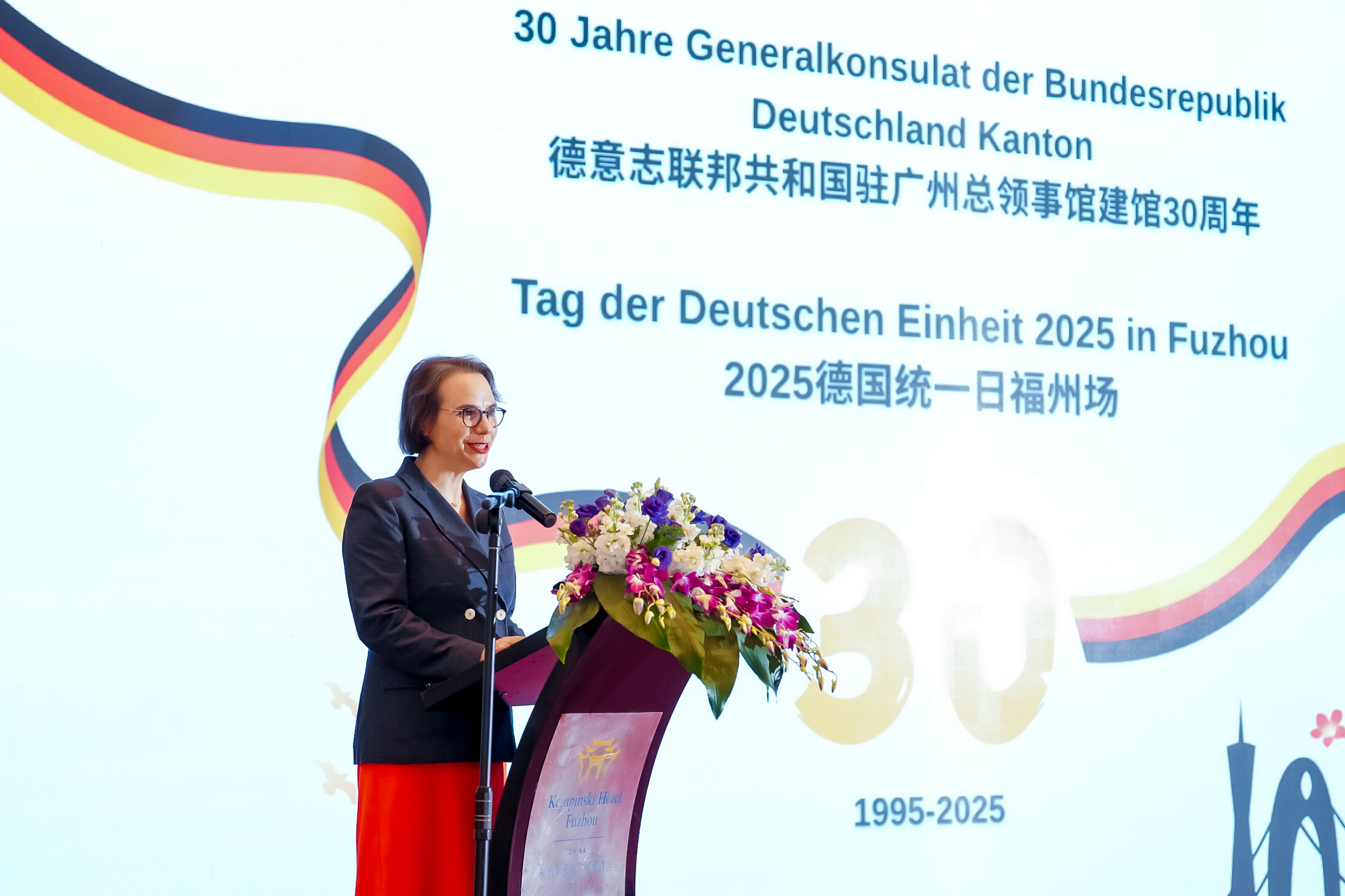 德国驻广州总领事万玉凤在致辞中表示,很高兴在就任总领事后不久即来福州参访并举办德国国庆招待会。今年是德国驻广州总领馆成立30周年,感谢福建省长期以来为推动德国与福建的交流合作所做的工作,期待双方在经贸、投资、友城、文化等领域进一步加强合作。