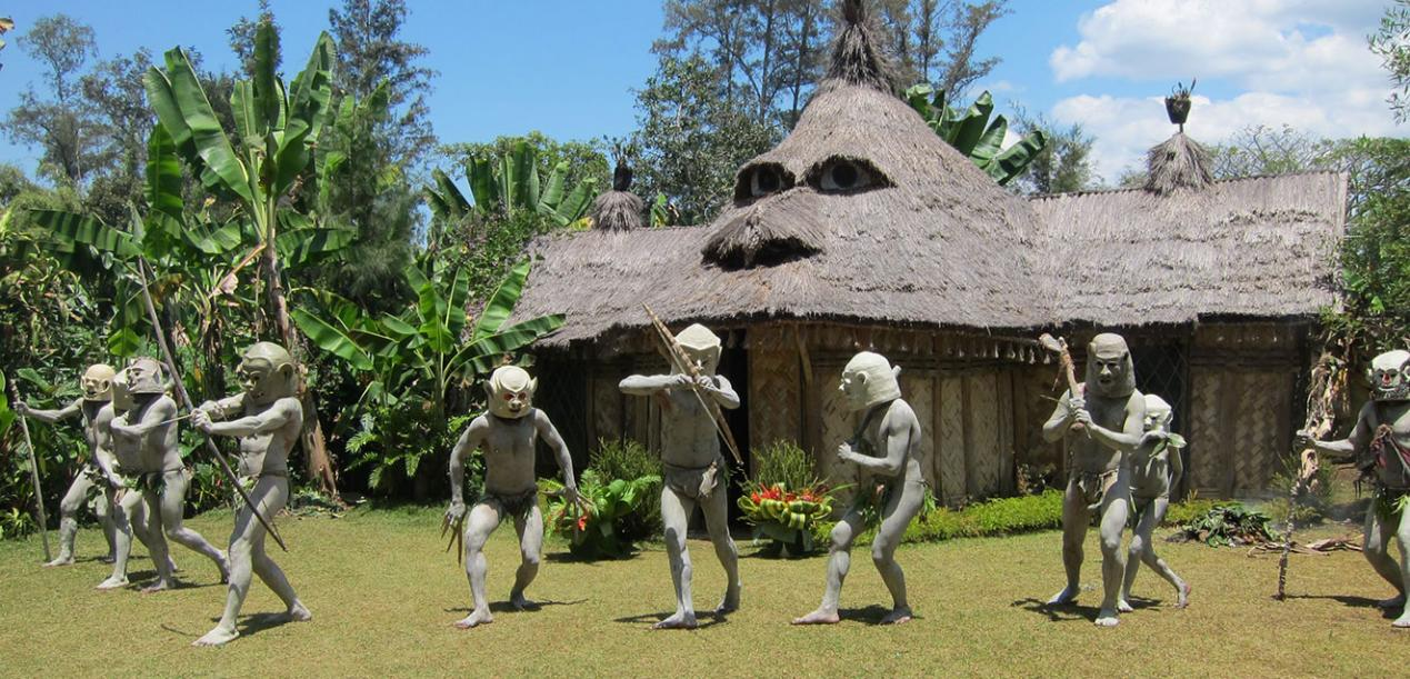 东高地传统房屋通常为圆形或长方形,外墙用野生甘蔗或竹子编织而成。房屋建得很低,以便在寒冷的气候下保持室内温暖;高耸的茅草屋顶则可避免烟气影响住户。当地有一种称作“mumu”的土灶烹饪法(mumu是巴新为庆典活动烹制大量食物时使用的一种传统烹饪方式。大致做法是挖一个土坑,用烧热的煤或岩石填满,再放入用芭蕉叶裹好的肉类、蔬菜、芋头、椰奶等食材,煮几个小时)。
