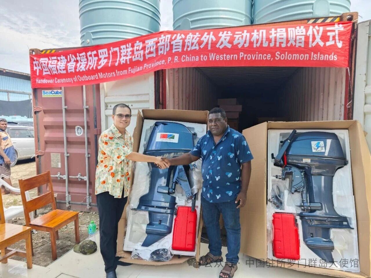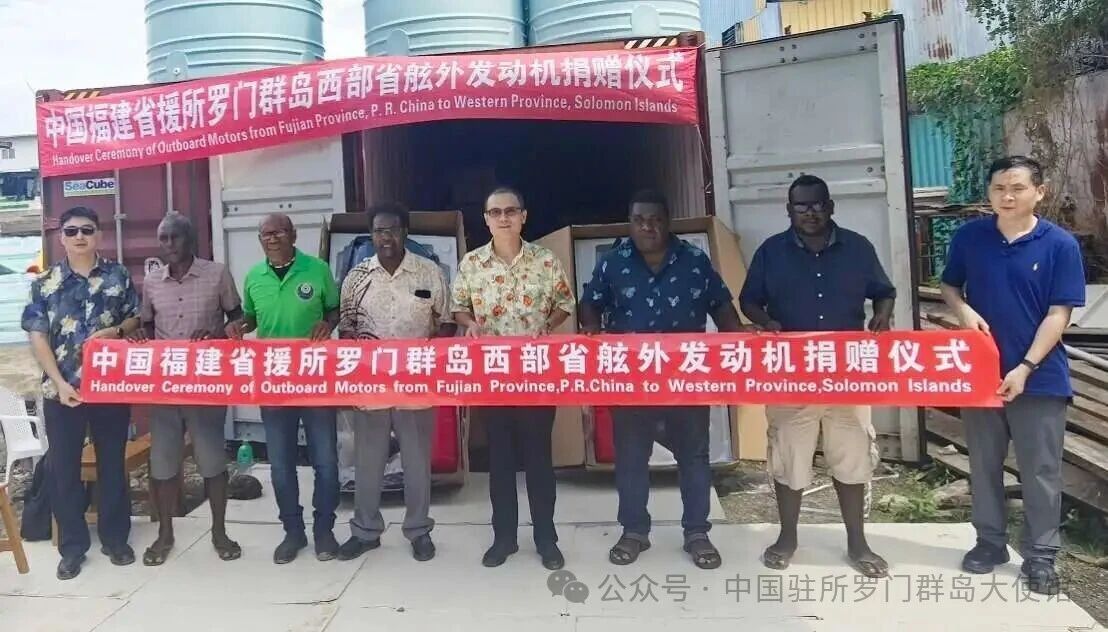 3月25日,中国驻所罗门群岛使馆向所西部省转交福建省捐赠的40台舷外发动机。杨杰公参、西部省副省长布莱恩、省秘帕特里克等出席。