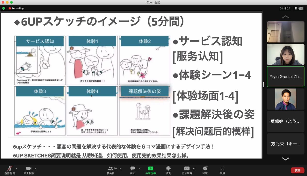 讲座后,两省县青年大学生协同合作,集思广益,挑战使用“六步描述法”进行创意构思。“六步描述法”指的是使用六张插画描述一个服务产品的出现、使用过程及使用结果。青年朋友们发挥想象,积极构思并踊跃发言,对自己的创意点进行细致的描述,交流气氛活跃。
